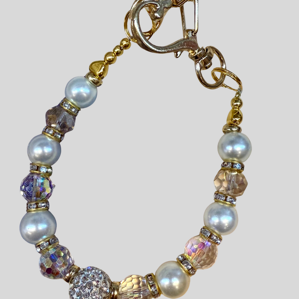 This stylish phone wristlet is stunning in the light. Crafted with faceted glass beads and rhinestone beads, it attracts everyone's interest. It features dual end clasps, including our signature Heart Clasp, allowing you to securely attach both ends to the phone lanyard connector (provided), creating a secure wristlet that holds your phone hands-free or attach one end to your keys and the other to a bag, purse or belt loop to secure your keys. This wristlet embodies the craftsmanship and quality our local business, Lynda Layne Gifts, is known for. Make a statement while enjoying the convenience of hands-free phone access or a key keeper. Add a charm to personalize.